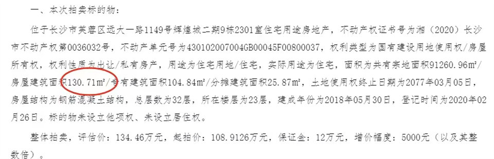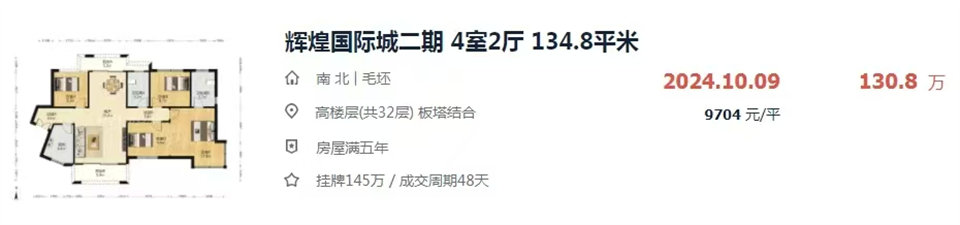 拍的最大的戶型,131平,四房兩廳兩衛(wèi),南北通透,23樓,108.9萬就拿下了。成交單價8300一平,比輝煌城三期的新房都便宜,還是現(xiàn)房,直接可以裝修入住。二手房最近一套同戶型的成交記錄是130萬,所以撿漏十幾萬絕對是有的。